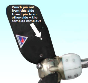 Be careful to use a gentle striking motion with a small hammer slightly biased towards the leading edge of the blade, which will force the leading edge of the pin towards the trailing edge, to ensure it enters the hole on the opposite face cleanly. [ The pin in effect pivots around the leading edge of the hole ] Do not force with heavy striking. If aligned correctly it will require no more force to go in than required to take out. This should not be a problem, just a little care and common sense.